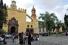 The most notable neighborhoods/communities include Xaltocan, Ejidos de Tepepan, La Noria, Las Cruces, Ejidos de Xochimilco and San Gregorio Atlapulco.[9] San Francisco Caltongo is one of the oldest neighborhoods of the borough.[10] Xaltocán began as a ranch or hacienda that belonged to the indigenous caciques. It was later donated to the San Bernardino de Siena monastery. After the monastery was secularized, it became hacienda land again, but over time, parts were sold and it became the current area of Xochimilco. The church for this community was built in 1751 as the hacienda chapel. Originally, it was dedicated to Jesus, then Candlemas and finally the Virgin of the Sorrows (Virgen de los Dolores). It officially became a sanctuary in 1951, declared by the archbishop of Mexico. In 1964, Xaltocán became a parish and in 1976, this church became the official parish church. The main celebration of the church is to an image of the Virgin Mary, which is said to have miraculously appeared in the pen of a turkey kept by an old woman.[11]