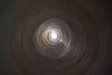 The building allows cold air to pour in from entries at the base of the structure and descend to the lowest part of the yakhchāl, large underground spaces up to 5,000 m3 (180,000 cu ft) in volume. At the same time, the tall conical shape of the building guides any remaining heat upward and outside through openings at the very top of the building, and through this active process the air inside the yakhchāl remains cooler than the outside. The yakhchāl is built of a unique water-resistant mortar called sarooj, composed of sand, clay, egg whites, lime, goat hair, and ash in specific proportions, that is resistant to heat transfer and is thought to be completely water-impenetrable.[2] This material acts as an effective insulation all year round. The sarooj walls are at least two meters thick at the base.[3]