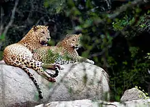 Including Sri Lankan elephant, 44 species of mammals are resident in Yala National Park,[2] and it has one of the highest leopard densities in the world.[11] 25 individual leopards are estimated to roam in Block I.[12] The elephant herd of Yala contains 300–350 individuals.[13] The Sri Lankan sloth bear, leopard, elephant, and wild water buffalo are all threatened mammals that Yala harbours. Although water buffaloes are indigenous to Sri Lanka, most populations contain genes of the domestic stock or have descended from feral populations. Toque macaque, golden palm civet, red slender loris, and fishing cat are among the other mammals that can be seen in Yala. The elephant population of the park varies seasonally.[9]