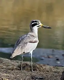 Yala is one of the 70 Important Bird Areas (IBAs) in Sri Lanka.[10] Of 215 bird species of the park, seven are endemic to Sri Lanka.[2] They are Sri Lanka grey hornbill, Sri Lanka junglefowl, Sri Lanka wood pigeon, crimson-fronted barbet, black-capped bulbul, blue-tailed bee-eater and brown-capped babbler. The number of waterbirds inhabiting wetlands of Yala is 90 and half of them are migrants.[3] Waterfowl (lesser whistling duck, garganey), cormorants (little cormorant, Indian cormorant), large waterbirds (grey heron, black-headed ibis, Eurasian spoonbill, Asian openbill, painted stork), medium-sized waders Tringa spp., and small waders Charadrius spp. are among the most common waterbirds. Black-necked stork and lesser adjutant are many of the rare birds that can be seen in the park. The migrant great white pelican and resident spot-billed pelican are also have been recorded. Other waterbirds attracted to the Yala lagoons include lesser flamingo, pelicans, and rare species such as purple heron, night herons, egrets, purple swamphen, and Oriental darter. Thousands of waterfowls migrate to the lagoons of Yala during the northeast monsoon. They are northern pintail, white-winged tern, Eurasian curlew, Eurasian whimbrel, godwits, and ruddy turnstone. The visiting species mingled with residing lesser whistling duck, yellow-wattled lapwing, red-wattled lapwing, and great stone-curlew. Rock pigeon, barred buttonquail, Indian peafowl, black stork, black-winged stilt, and greater flamingo are among the other bird species. Crested serpent eagle and white-bellied sea eagle are the raptors of the park. The forest birds are orange-breasted green pigeon, hornbills, Old World flycatchers, Indian paradise flycatcher, Asian barbets, and orioles.[9]