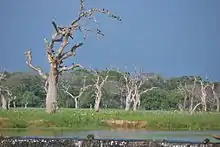 Yala lay in the direct path of the 2004 Indian Ocean tsunami, which impacted Sri Lanka 90 minutes after its generation.[4] The tsunami caused severe but localized damage on the park,[5] with around 250 people being killed.[6] The tsunami wave was reported to be 20 feet (6.1 m) high. The tsunami waves reached inland only through the river-mouth gaps in the coastal dunes.[7] Inundation distances from ranged up to 392 to 1,490 metres (429 to 1,629 yd). The main habitats affected are scrub forest and grasslands. About 5,000 hectares (19 sq mi) of grassland, forest, and wetland were directly affected by the tsunami. The satellite images revealed that mean Normalized Difference Vegetation Index (NDVI) range from 0.245–0.772 in the Block I and II. After the disaster the NDVI value fell dramatically to 0.2111. Around 60% of the area along the coastline has changed. The damage was worse closer to the sea.[5] The movement patterns of two radio collared elephants were analyzed. The study found out that their movements were consistent with behaviour prompted by immediate cues generated by the tsunami waves rather than a response to a "sixth sense".[8]