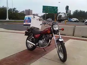The SR250 was produced from 1980 to 1982 in the United States, as well as from 1982 to 2002 in Spain, in two versions. While it has stylistic similarities with its older brothers the SR500 and SR400, the SR250 is very much a commuter bike. In 1980 Cycle World's test of the SR250, called the Exciter I in the US with added high, cruiser style handlebars, found a standing 1⁄4-mile (0.40 km) time of 16.36 seconds at 122.89 km/h (76.36 mph), acceleration from 0 to 97 km/h (0 to 60 mph) of 11.5 seconds, and a top speed of 130 km/h (80 mph).[1] Braking distance from 60 to 0 mph (97 to 0 km/h) was 38 m (125 ft), and tested fuel consumption was 76 mpg‑US (3.1 L/100 km; 91 mpg‑imp), giving a range of 269 km (167 mi).[1]