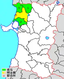 With the establishment of the municipality system on April 1, 1889, two towns (Noshiroko and Hiyama) and 24 villages were established. Futatsui was raised to town status on June 4, 1902, followed by Kado on January 1, 1932. Noshiroko became the city of Noshiro on October 1, 1940.