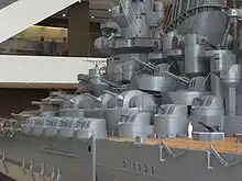 Initially, heavy anti-aircraft defence was provided by a dozen 40-calibre 127-millimetre Type 89 dual-purpose guns in six twin turrets, three on each side of the superstructure. In 1944, the two amidship 15.5 cm turrets were removed to make room for three additional 127-millimetre mounts on each side, bringing the total number of these gun to twenty-four.[57] When firing at surface targets, the guns had a range of 14,700 metres (16,100 yd); they had a maximum ceiling of 9,440 metres (30,970 ft) at their maximum elevation of 90 degrees. Their maximum rate of fire was 14 rounds a minute; their sustained rate of fire was around eight rounds per minute.[58]
