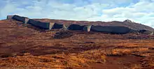 As with other Goguryeo forts, Yanzhou village was built on a hill adjacent to a river, with the river forming a natural barrier. Cliffs form the southern side of the city and a high defensive wall formed an arch around the west, north and east sides. The land slopes such that the eastern side of the city is significantly higher than the west. The site is about 480 metres long and 440 metres wide. The city walls, which are still visible today, cover some 1840 metres in length.[3] The walls were 2 to 3 metres thick and between 5 and 8 metres high with towers at regular intervals along its length, and is comparable to the Great Wall of China in its dimensions. At the top of the ridge are the remains of a square tower with a wall enclosed area to its east. The gate to the city was to the west, near the Taizi River. The construction is of rough-cut stone built dry without mortar.