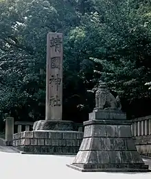 The site for the Yasukuni Shrine, originally named Tōkyō Shōkonsha (東京招魂社, "shrine to summon the souls"), was chosen by order of the Meiji Emperor.[3] The shrine was established in 1869, in the wake of the Boshin War, in order to honor the souls of those who died fighting for the Emperor. It initially served as the "apex" of a network of similar shrines throughout Japan that had originally been established for the souls of various feudal lords' retainers, and which continued to enshrine local individuals who died in the Emperor's service. Following the 1877 Satsuma Rebellion, the Emperor had 6,959 souls of war dead enshrined at Tōkyō Shōkonsha.[4] In 1879, the shrine was renamed Yasukuni Jinja. The name Yasukuni, quoted from the phrase 「吾以靖國也」 in the classical-era Chinese text Zuo Zhuan (Scroll 6, 23rd Year of Duke Xi), literally means "Pacifying the Nation" and was chosen by the Meiji Emperor.[5] The name is formally written as 靖國神社, using obsolete (pre-war) kyūjitai character forms.