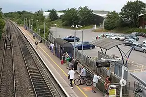 The station is staffed on weekday mornings.[1] It has two staggered platforms, separated by the A432 road bridge. An automated ticket machine was installed in mid-2007, but stopped functioning due to vandalism and is reported to be "unlikely to be replaced in the foreseeable future".[2] A new ticket machine was installed in 2013 on platform 1, whilst the portakabin ticket office is on the opposite platform. Digital information screens, customer help points and timetable posters provide train running information, whilst CCTV was installed here in 2011.[3] Step-free access to both platforms is available (via ramps from the road bridge to platform 1).