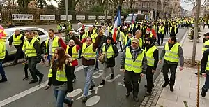 The yellow vests movement or yellow jackets movement (French: Mouvement des gilets jaunes, pronounced [muvmɑ̃ de ʒilɛ ʒon]) is a populist,[66] grassroots[67] protest movement for economic justice[68] that began in France in October 2018. After an online petition posted in May had attracted nearly a million signatures, mass demonstrations began on 17 November.[69] The movement was initially motivated by rising fuel prices and a high cost of living; it claims that a disproportionate burden of the government's tax reforms were falling on the working and middle classes,[70][71][72] especially in rural and peri-urban areas.[34][73] The protesters have called for lower fuel taxes, a reintroduction of the solidarity tax on wealth, a minimum-wage increase, the implementation of Citizens' initiative referendums,[41] among other things. On 29 November 2018, a list of 42 demands was made public and went viral on social media, becoming de facto a structuring basis for the movement, covering a wide range of eclectic topics, mostly related to democracy, social and fiscal justice.[40][74]