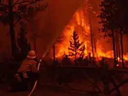 Between September 5 and 7, a dry front pushed flames along the southern section of the North Fork fire towards the large Old Faithful visitor complex adjacent to the Upper Geyser Basin.[23] All non-emergency personnel were ordered to be evacuated; however, political issues influenced National Park Service management directives and the complex was not completely closed to incoming tourists, with some visitors still arriving at Old Faithful not long before the intense fire hit by mid afternoon. An all out aerial bombardment with air tankers dropping fire retardant failed.[22] Firefighters concentrated on structure protection, especially those of historical significance such as the Old Faithful Inn, using fire engines and portable water pumping systems to keep the roofs and other surfaces of the structures wet. 1,200 firefighters including 120 military personnel dug fire lines and cleared away brush near structures. Winds crested up to 80 miles per hour (130 km/h) as the fire approached from the west.[25]