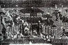 A rubbing of a Chinese Han Dynasty (202 BC – 220 AD) pictorial stone (i.e. the Yinan stone carving of Shandong province, China) showing an ancestral worship hall (祠堂) with closed doors, a person outside making a sacrificial offering to his ancestors, and horses and trees in the background.