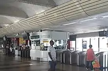The station was designed by Mott, Hay and Anderson, and it consists of a ticketing concourse on the ground floor and the station platforms on the upper level. The ticketing concourse is encircled by glass walls, while the platforms are open to the surroundings. These features, along with slim columns clad in tiles, are intended to give the station a bright and graceful look.[2]