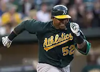 On March 28, in his major league debut, he went 1 for 3, and was also hit by a pitch.[14] The following day, he hit his first major league home run, a 2-run shot off Seattle Mariners relief pitcher Shawn Kelley.[15] Céspedes had hit his first walk-off home run on June 21 against the Los Angeles Dodgers with the final score of 4–1, resulting in a three-game sweep. The Athletics would go on to win the American League West, with Céspedes batting .316 with a .381 OBP in the postseason.