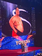 Although the Yokozuna character was portrayed as a champion sumo wrestler, Anoaʻi never competed as an actual sumotori. Though Yokozuna wrestled as a representative of Japan, in real life Anoaʻi was Samoan American and was accordingly billed as hailing from Polynesia. However, he was managed by the Japanese character Mr. Fuji (in reality a Japanese American), who would follow Anoaʻi to the ring with a wooden bucket of salt and waving a Japanese flag.[1]