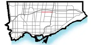 In the 1970s, when the Toronto Transit Commission extended the Yonge Street subway line north from the Eglinton terminus, a new roadway alignment from York Mills to Wilson was completed in 1973 to accommodate 96 Wilson Avenue buses running directly to the new York Mills subway station rather than travelling south on Yonge Boulevard to Yonge Street terminus at Glen Echo Loop.[2] Landmarks along York Mills Road include a recreation complex at Bayview Avenue, York Mills Collegiate Institute, a large Rogers Communications complex past Leslie Street, and the former site of the Upjohn Company of Canada near Don Mills Road at Upjohn Road.