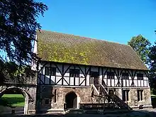 The Hospitium is located between the ruins of St. Mary's Abbey Church and the River Ouse and is thought to have originally been a guest house for visitors to the abbey of low social rank, or possibly a barn. It was originally part of a group of buildings in the abbey grounds that included a brew-house, stables, mill and, near the main gate, a boarding school with 50 pupils. The oldest parts of the ground floor were built around 1300, but the upper storey has been extensively restored in modern times. The ruined gateway at the side dates back to the 15th century, and was probably the entrance to a passage that ran towards the water-gate by the river.[44]