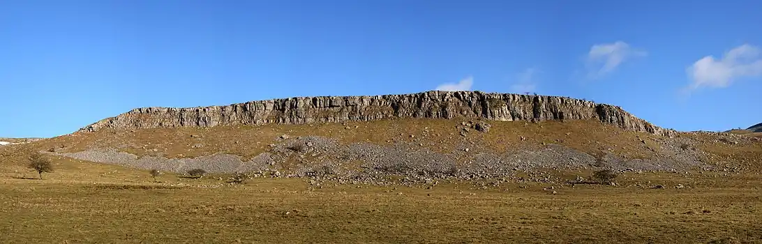 The dales are 'U' and 'V' shaped valleys, the former enlarged and shaped by glaciers, mainly in the most recent Devensian ice age.[30] The underlying rock is mainly Carboniferous Limestone, which results in a large areas of karst topography,[8] in places overlain with shale and sandstone and topped with Millstone Grit,[31] although to the north and west of the Dent Fault[32] the hills are formed from older Silurian and Ordovician rocks.[33][34]