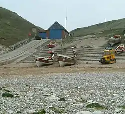 Some of the first experiments in deep-sea trawling were conducted off the Holderness Coast at Flamborough in the early part of the 19th century.[13] However, until the days of large fishing trawlers in the 20th century, the most common boat in service across Yorkshire (and the north east coast) was the Coble. The design of the coble is a basic one with a short plank laid horizontally instead of a keel and a flat bottom on the boat. The flat bottom allowed the coble to be berthed almost anywhere as it did not need extensive harbour facilities; most cobles where simply hauled onto the beaches when not in use.[14]
