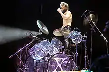 Yoshiki said he considers himself a groove drummer.[235] He normally wears a neck brace when playing the drums; as a result of his years of "headbanging" while drumming, he injured his neck and had to undergo surgery.[235][236] In 2015, Yoshiki stated he is more of a songwriter than a drummer.[165]