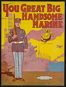 "You Great Big Handsome Marine" is a World War I era song released in 1918. Most sources solely credit Harold Dixon as both the composer and lyricist, as it is listed on the sheet music.[1][2][3] Other sources give composer credit to Dixon and lyricist credit to I. Chapman. The song was published by Dixon-Lane Publishers of St. Louis, Missouri. On the cover is a soldier standing at attention. A battleship is behind him, and planes are flying overhead.[4][5] The song was written for both voice and piano.[2][4]