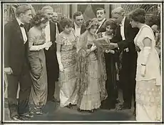 Scene still featuring Nellie Nolan (Edith Taliaferro) who learns that the person she is impersonating has just inherited a fortune. Behind her, the criminal Spagnoli (Al Ernest Garcia wearing a small dark moustache) begins to plot.