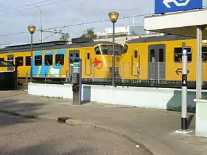 ![]() Sprinter trains in old NS colours, holding at Zaandijk Zaanse Schans station | |||||||||||||||