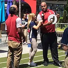 Banner was signed by the Pittsburgh Steelers on August 12, 2018.[48] He played 22% of offensive snaps for the Steelers, in 14 games (one start, in Week 12), in 2019.[49][30][50] He played his first game for the Steelers on September 15 against Seattle, and made his first NFL start on November 24 against Cincinnati.[30] He had 24 pass protection reps, during which he did not allow a single pressure, quarterback sack, hurry, or quarterback hit.[51] Banner became a cult hero who was featured in viral videos showing the team's largest player running downfield and flattening linebackers and defensive backs who got in his way, known to many fans as "No. 72" because he would be announced as "No. 72 is reporting as eligible" at home games, which was met with increasingly loud cheers and ovations throughout the season.[52][49][53][54]
