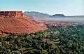 It is flanked by the mountain Zagora from which the town got its name. Originally it was called 'Tazagourt' (ⵜⴰⵣⴰⴳⵓⵔⵜ) the singular of plural 'Tizigirt' (ⵜⵉⵣⵉⴳⵉⵔⵜ), Berber for 'twinpeaks', referring to the fortress of the Murabitun, or Almoravid, people. In old European maps the mountain Zagora is already indicated but the town itself was only built in the 20th century. On the top of the Zagora mountain the remains of an Almoravid fortress can still be seen.[1] The exact location of the former Almoravid mosque is still a matter of dispute. Each year the moussem (festival) of the Sufi saint moulay Abdelkader Jilali is celebrated at Zagora. Languages spoken in the city include Moroccan Arabic, Tachelhit and Tamazight. A sign at the town border states "Tombouctou 52 days", the supposed time it takes to get to Timbuktu, Mali on foot or camel. The original sign has been replaced by a mural painting.[2]