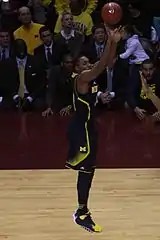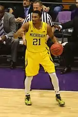 Irvin joined a team that had just lost Trey Burke and Tim Hardaway, Jr. to the 2013 NBA draft.[12][13] The 2012–13 Wolverines had reached the championship game of the 2013 NCAA Men's Division I Basketball Tournament, losing to Louisville.[14] Prior to his freshman season, Sporting News named him the second best Big Ten Conference newcomer.[15] On November 8, the Wolverines opened the season against UMass Lowell. Michigan played six freshman and Irvin was one of five who came off the bench in his debut that night; he scored 10 points.[16][17] When 2013–14 Wolverine team leading scorer Stauskas sat out the November 29 game against Coppin State, Irvin posted 24 points on 9-for-13 field goal shooting, including 6-for-10 three point shooting as Michigan won in an 87–45 rout.[18][19] He was recognized on December 2, with a Big Ten Conference Freshman of the Week honor.[20] On December 21, he posted 12 points (on 4–8 three point shooting) and 6 rebounds against Stanford.[21] On December 23, he earned co-Freshman of the Week honors with Noah Vonleh from the Big Ten Conference.[22] Michigan clinched its first outright (unshared) Big Ten Conference championship since 1985–86.[23] The 2013–14 team advanced to the elite eight round of the 2014 NCAA Men's Division I Basketball Tournament before being eliminated by Kentucky.[24]