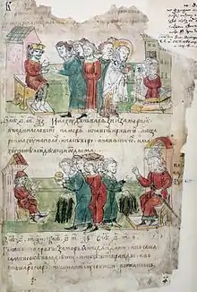 The text from Radzivill Chronicle: "Bulgarians saw that they cannot resist, and asked to baptize them and fell to the Greeks. The Tsar christened their prince and all the boyars..." | |