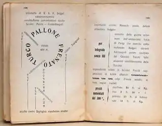 Zang Tumb Tumb (usually referred to as Zang Tumb Tuuum) is a sound poem and concrete poem written by Filippo Tommaso Marinetti, an Italian futurist. It appeared in excerpts in journals between 1912 and 1914, when it was published as an artist's book in Milan. It is an account of the Battle of Adrianople, which he witnessed as a reporter for L'Intransigeant. The poem uses Parole in libertà (words in freedom; creative typography) and other poetic impressions of the events of the battle, including the sounds of gunfire and explosions. The work is now seen as a seminal work of modernist art, and an enormous influence on the emerging culture of European avant-garde print.[1]