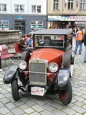 The Z 18 had a rectangular frame with rigid axles.[2] The water cooled, two stroke two cylinder engine drove the rear wheels through a three speed gearbox. It had a bore of 80 mm (3 1⁄6 in) and stroke 100 mm (4 in), capacity of 1,004 cc (61.3 in3) and a Zenith carburettor.[3] The standard car was fitted with 730 x 130 disc wheels, although more expensive versions had Rudge-Whitworth wire wheels. The basic body style was a four seat phaeton which cost 35,000 Kčs in 1926. It was open-top with a single door on the left, steering wheel on the right and a bench seat that was accessed by lowering the left front seat.[1] In September 1926, a limousine version was launched at the Prague Motor Show at a price of 40,500 Kčs. This had a fixed roof with four side windows and more equipment, including an electric cigar lighter and coat hanger. A sports roadster was also available, priced at 45,000 Kčs. Gradually over time, two and four door phaetons, landaulets and other custom designs were added to the range.[1] There was also a pickup truck capable of carrying a 500 kg (1,100 lb) payload.[4]