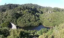 Historically about 60% of the Wellington region was covered with broadleaf forest. Karaka, kohekohe, ngaio and nikau trees were common but there were also rata, rewarewa and tawa with occasional podocarps like kahikatea and rimu.[5] The whole sanctuary valley was covered with this sort of forest until European settlement of the area and the large fires in 1850 and 1860 that cleared the land to be used for farming. The lower reservoir, retained by an earth dam, was completed in 1878.[6] Parts of the area continued to be farmed up until 1906 when the remaining catchment was purchased for the water works.[6] The upper reservoir, retained by a concrete gravity arch dam, was completed in 1908.[7] From this point, as the whole valley was a protected water catchment area for Wellington city, the slopes were re-vegetated with introduced trees and the native forest also began regenerating. The upper dam was decommissioned as a reservoir about 1991, the lower one in 1997.[6]