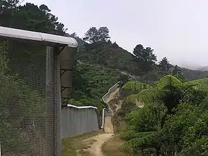 The most crucial aspect of the sanctuary is a pest-exclusion fence, designed to exclude fourteen species of non-native land mammals ranging from deer to mice, which encircles the 8.6 km perimeter of the Sanctuary.[10] Construction of the fence was completed in late 1999 and all mammalian pests within the perimeter were then eradicated over a nine-month period. This predator-proof fence is of great conservation significance, being a world first.[11]