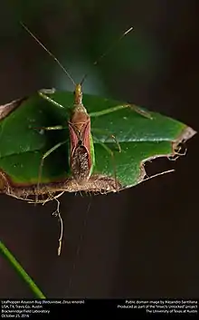 Z. renardii is a medium to large hemipteran with an average total length between 10.57-14.25 mm.[4][5] It is generally greenish-yellow ventrally and yellow-brown dorsally, with the corium distinctly reddish with paler venation.[4][5] It also has a long, robust body[4][7] with a cylindrical head, small reddish eyes, and a thick curved rostrum.[4][5] The front tibia are covered posteriorly by glandular setae which secrete a sticky substance.[4] Distinguishing it from other Zelus species, the scutellum is long and bears no projections and the last ventral abdominal segment is slender with a hooked median process apically.[4][5]