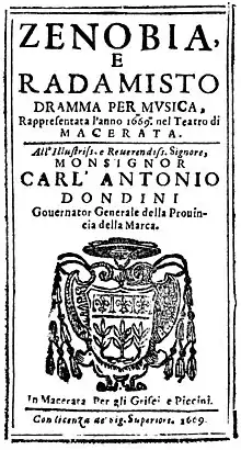Zenobia e Radamisto is an opera in 3 acts and nine scenes by composer Giovanni Legrenzi. The opera uses an Italian language libretto by Ippolito Bentivoglio (1611–1685). The third opera written by Legrenzi, the work premiered on 1 June 1665 at the Teatro Bonacossi in Ferrara in celebration of the marriage of Nicolò Santini and Maria Luisa Bonvisi.[1][2] The opera was subsequently mounted in Brescia (1666), Verona (1667), and Macerata (1669).[3]