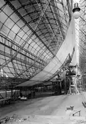 The principal feature of the Zeppelin's design was a fabric-covered rigid metal framework made up of transverse rings and longitudinal girders containing a number of individual gasbags.[6] The advantage of this design was that the aircraft could be much larger than non-rigid airships, which relied on a slight overpressure within the single pressure envelope to maintain their shape. The framework of most Zeppelins was made of duralumin (a combination of aluminum and copper as well as two or three other metals—its exact content was kept a secret for years). Early Zeppelins used rubberized cotton for the gasbags, but most later craft used goldbeater's skin, made from the intestines of cattle.[7]