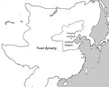 Under the Mongol Yuan dynasty, the Central Secretariat with enlarged functions stood along as the sole organ to lead the civil administration in the Yuan realm, as the Yuan founder Kublai Khan wanted a centralized executive agency that took charge of all civil governing affairs throughout the empire. Models for it had long been part of Chinese imperial government, but now it was to function in a new context.[1] The Central Secretariat also directly governed a large territory surrounding the Yuan capital Khanbaliq (modern Beijing) known as the Central Region (腹裏, fuli), including the present-day Hebei, Shandong, Shanxi, the south-eastern part of present-day Inner Mongolia and the Henan areas to the north of the Yellow River (initially also the Mongolian steppe). Branch Secretariats (行中書省) were set up throughout the empire and were subordinated to the Central Secretariat. Branch Secretariats gradually became provincial-level administrative organizations or institutions known simply as the provinces (行省), though they were not exactly provinces in modern sense. There were 11 "regular" provinces in the Yuan dynasty.[2] The Yuan Central Secretariat was adopted by the early Ming dynasty, and the Central Secretariat was led by the Chancellor of China, although unlike the Yuan it did not directly control the Central Region. It was eventually abolished in 1380 after the last Chancellor Hu Weiyong was killed by Hongwu Emperor, the first emperor of the Ming, who later established the Grand Secretariat. The Central Secretariat was no longer set up again by later rulers of China, and the Three Departments and Six Ministries structure was officially replaced by the Six Ministries structure.