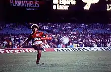 He was also a set-piece specialist, who was renowned for his ability to bend the ball and score from dead ball situations, and is considered to be one of the greatest free kick takers of all time.[3][5][7][13][36] Zico's unique free kick technique, which saw him place significant importance on his standing foot, often saw him lean back and raise his knee at a very high angle when hitting the ball with his instep, thus enabling him to lift it high over the wall, before it dropped back down again; his method of striking the ball allowed him to score free kicks even from close range, within 20 to 16 metres from the goal, or even from just outside the penalty area. Moreover, due to his technique, mentality, unpredictability, and accuracy in dead ball situations, he was capable of placing the ball in either top or bottom corner on either side of the goal, which made it difficult for goalkeepers to read his free kicks.[36][46][47] His ability from set-pieces inspired several other specialists, such as Roberto Baggio and Andrea Pirlo.[48][49]