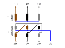 Nine-winding, three-phase transformers typically have 3 primaries and 6 identical secondary windings, which can be used in zigzag winding connection as pictured.[2] As with the conventional delta or wye winding configuration three-phase transformer, a standard, stand-alone transformer containing only six windings on three cores can also be used in zigzag winding connection, such transformer sometimes being referred to as a zigzag bank.[2] In all cases, six or nine winding, the first coil on each zigzag winding core is connected contrariwise to the second coil on the next core. The second coils are then all tied together to form the neutral, and the phases are connected to the primary coils. Each phase, therefore, couples with each other phase, and the voltages cancel out. As such, there would be negligible current through the neutral point, which can be tied to ground.[5]