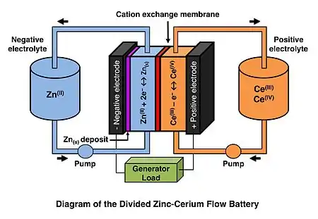Zinc–cerium batteries are a type of redox flow battery first developed by Plurion Inc. (UK) during the 2000s.[1][2] In this rechargeable battery, both negative zinc and positive cerium electrolytes are circulated though an electrochemical flow reactor during the operation and stored in two separated reservoirs. Negative and positive electrolyte compartments in the electrochemical reactor are separated by a cation-exchange membrane, usually Nafion (DuPont). The Ce(III)/Ce(IV) and Zn(II)/Zn redox reactions take place at the positive and negative electrodes, respectively. Since zinc is electroplated during charge at the negative electrode this system is classified as a hybrid flow battery. Unlike in zinc–bromine and zinc–chlorine redox flow batteries, no condensation device is needed to dissolve halogen gases. The reagents used in the zinc-cerium system are considerably less expensive than those used in the vanadium flow battery.