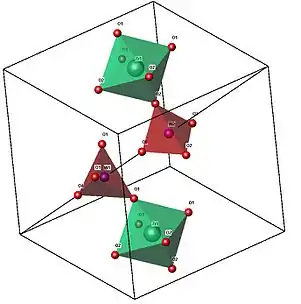 The structure has P213 space group symmetry at low temperatures. At higher temperatures, a centre of inversion is introduced by the disordering of the orientation of tungstate groups, and the space group above the phase transition temperature (~180C) is Pa.
