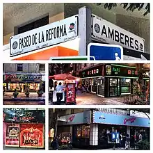 Another prominent retail segment includes businesses that cater to Mexico City's gay community. Since they were established in the 1990s, these businesses have grown in size and number and include sex shops, bookstores, movie theaters and exclusive hotels, as well as bars and nightclubs. These total over 200 businesses spread over 16 blocks, which is now considered to be the community business center.[9] Most customers in Zona Rosa's businesses are visitors from other parts of the city, foreign tourists, and businessmen who come from nearby office buildings concentrated on or near Paseo de la Reforma.[3][10] The area that connects Metro Insurgentes with Zona Rosa tends to become crowded with street peddlers selling tamales, perfumes, handicrafts, unlicensed CDs/DVDs and more to passerby groups.[3]