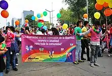 Zona Rosa's annual pride parade is officially called the Marcha del Orgullo Lésbico, Gay, Bisexual, Transgénero, Travesti, Transsexual e Intersexual (LGBTTTI) (March of Lesbian, Gay, Bisexual, Transgender, Transvestite, Transsexual and Intersexual Pride).[25] It was first held in 1978 with about 300 people participating.[26] During this event, the nightclubs, discothèques and bars of Zona Rosa fill with members of the LGBT community starting at midday. Many businesses, whether they cater to gays or not, are decorated with rainbow colored balloons, streamers and other items. Despite the crowds, police presence is not significantly heightened.[27]