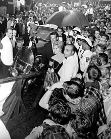 On June 14, 1989, in Beverly Hills, California, Gabor was accused of slapping the face of Beverly Hills police officer Paul Kramer when he stopped her for a traffic violation at 8551 Olympic Boulevard.[53] At trial three months later, a jury convicted her of slapping Kramer. They also found her guilty of driving without a license and possessing an open container of alcohol—a flask of Jack Daniel's—in her $215,000 Rolls-Royce, but acquitted her of the charge of disobeying Kramer when she drove away from the traffic stop.[54] On October 25, 1989, Beverly Hills Municipal Judge Charles G. Rubin sentenced Gabor to serve three days in jail, to pay fines and restitution totaling $12,937, to perform 120 hours of community service, and to undergo a psychiatric evaluation.[55] On June 14, 1990, Gabor dropped her conviction appeal and agreed to serve her sentence.[56] However, she refused to take part in community service and served three days in jail from July 27 to July 30, 1990.[57]